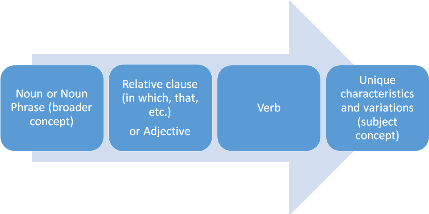 Start with noun of broader concept Use of relative clause 'who' Concise Stand alone Exclude example Exclude procedural information |