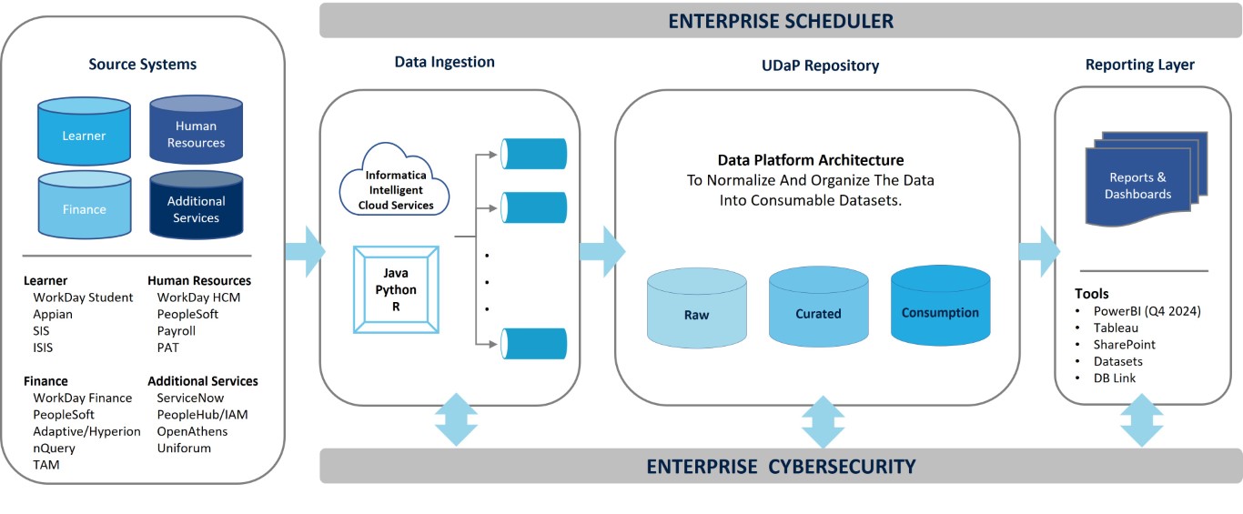 UBC's enterprise data warehouse, UDAP, holds consumable data that receives nightly ETL (Extract Transform Load) processes, as summarized in the diagram below. Source systems are enhanced and added each year to provide a reliable and secure platform for datasets that are available to the community.